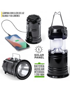 Solar-powered multi-functional lamp with integrated 1,200 mAh auxiliary battery and flashlight. Made in durable ABS material, with metal folding handles. Functions:Lamp with 6 white light LEDs and 60 lumens.Torch with 1 white light LED and 20 lumens1,200 mAh lithium auxiliary battery with USB output and Micro USB input, Micro USB charging cable included...