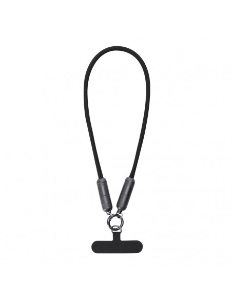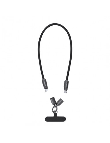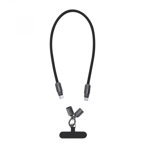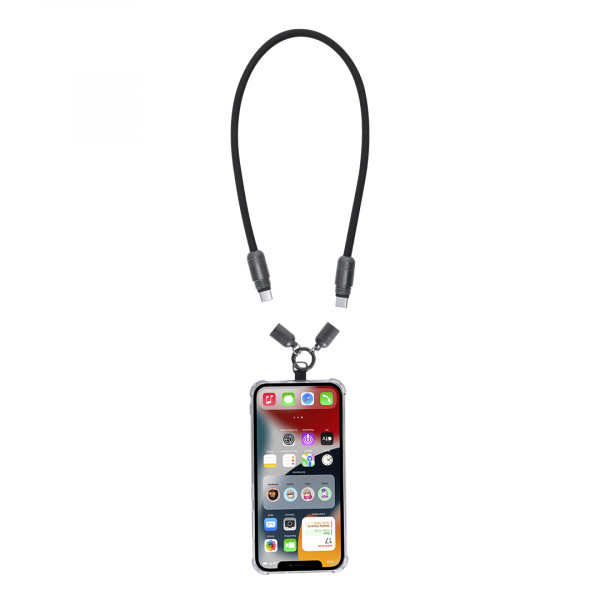 Charging lanyard cable with data transfer function and mobile stand. With Type-C input/output and 60W capacity, allowing fast charging. Functionality and convenience in a single accessory. Suitable for data transfer. Type C Connection PD 60W