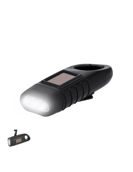 Flashlight in Recycled ABS with solar charging and manual charging with 360° adjustable dynamo system. It has 3 white light LEDs powered by both a rechargeable solar panel and 3 40mAh button type batteries. It includes a functional carabiner-shaped grip handle that can be easy to transport. A practical solution to always stay prepared. 3 Leds. Solar and Hand Charging. Battery 40 mAh