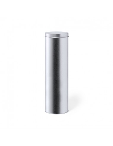 Presentation box in cylindrical format, made in resistant metal with silver finish and matching lid.