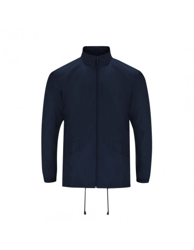 Unisex high-neck rain jacket with detachable hood. The hood features adjustable drawstrings for a personalised fit and Velcro fastening for easy folding and storage. The interior is lined with a silver coating for added protection. Includes a central zip fastening with a tone-on-tone puller, two side pockets with flaps, elasticated cuffs for a comfortable fit, and an adjustable hem with inner drawstrings for extra customisation. An elastic band inside one of the pockets allows the jacket to be conveniently folded and stored when not in use.