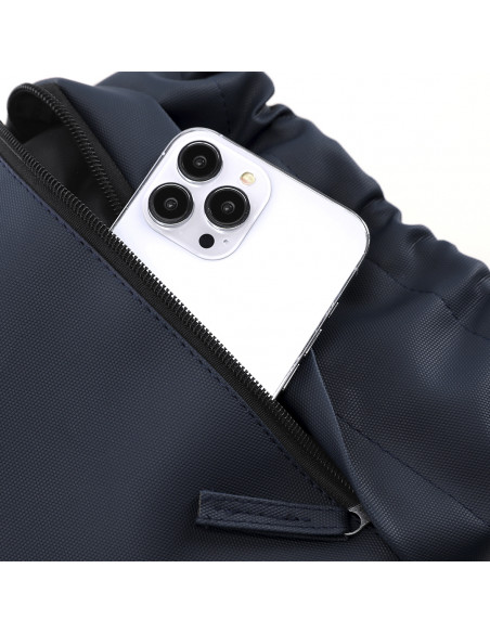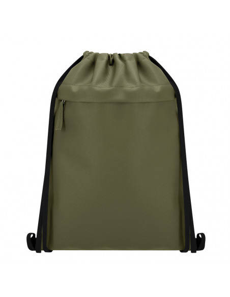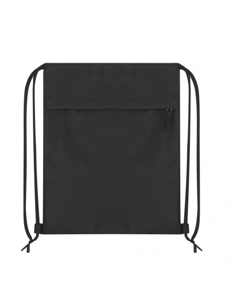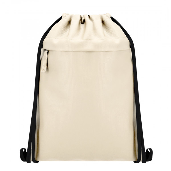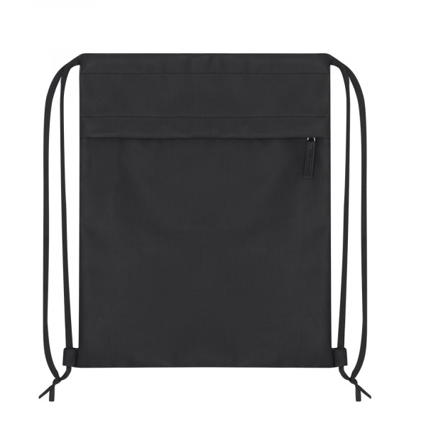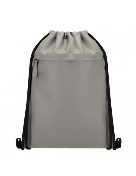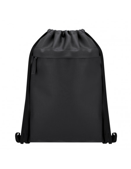Drawstring backpack made of soft PU combined with durable 600D polyester. Features a functional front pocket with zipper closure and matching PU puller.