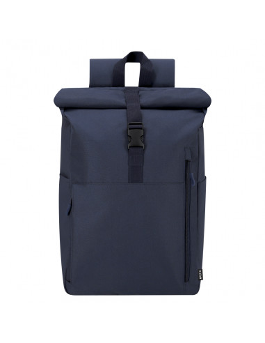 Backpack made of durable 300D RPET with roll-top closure and buckle. Features two front pockets, a rear pocket with side access, and two additional side pockets. Spacious interior with padded compartment for laptops up to 15 inches. Padded shoulder straps and back. Includes trolley strap for easy attachment to suitcases, ideal for travel and commuting. RPET material is made from recycled plastic, encouraging the reuse of plastic waste and helping to promote the planets sustainability. Padded Laptop Compartment. Padded Back and Shoulder Straps