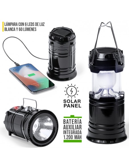 Solar-powered multi-functional lamp with integrated 1,200 mAh auxiliary battery and flashlight. Made in durable ABS material, with metal folding handles. Functions:Lamp with 6 white light LEDs and 60 lumens.Torch with 1 white light LED and 20 lumens1,200 mAh lithium auxiliary battery with USB output and Micro USB input, Micro USB charging cable included (5V DC 1A).Presented in an individual kraft design box, with instruction manual in English and Spanish. The capacities shown in all our external auxiliary batteries are real, all of them incorporating non-recycled, grade A batteries, with a service life of at least 500 charging cycles, and complying with CE regulations. In addition, they are manufactured according RoHS standards, and in compliance with the following safety requirements: Power bank overcharge protection system. Complete discharge protection system, which increases the durability of the power bank. Blocking system to prevent short circuits. Constant charging transfer system, in accordance with the capacity of the target device. 7 Leds. 1200 mAh. Solar Charging. USB Output. Micro USB Input