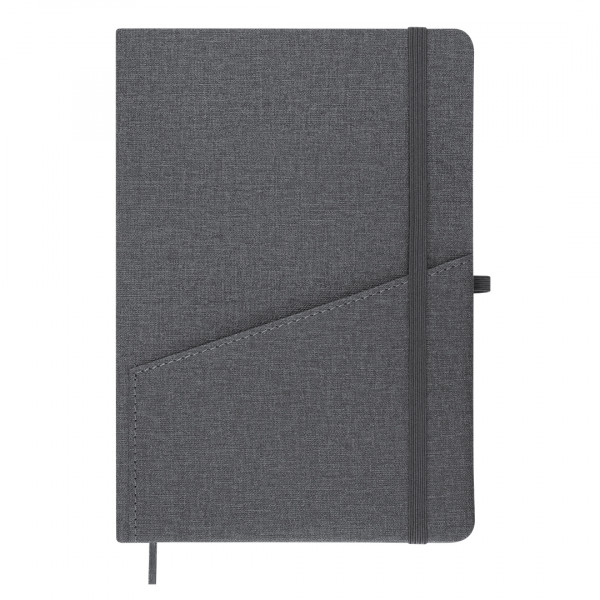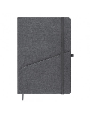 Bloc de notas con cubiertas rígidas y elaborado en PU, acabado lino. Con práctico bolsillo frontal, soporte para bolígrafo, marcapáginas y cinta elástica de cierre a juego. Incluye 80 hojas color crema con disposición a rayas. Con distintivo de PU Reciclado. La PU Reciclado destaca por su resistencia y elasticidad. Este material reciclado y reciclable es una opción sostenible que rescata las fibras desechadas en los procesos de fabricación, minimizando así el desperdicio de material y contribuyendo a su vez a reducir el impacto ambiental, manteniendo a la vez sus propiedades originales. Portada Rígida. 80 Hojas