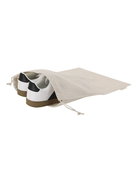 Bolsa en algodón reciclado120g/m2. Con cordones para ajustar cierre. Resistencia máxima de 4 kg. Logotipo en etiqueta lateral.