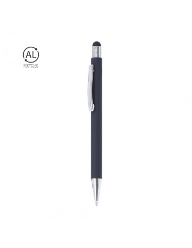 Bolígrafo puntero de mecanismo pulsador fabricado en aluminio reciclado. Pulsador y clip metálico en acabado cromado, acabado en puntero a juego. Cuerpo terminación en goma, especialmente diseñado para marcaje en láser. Distintivo aluminio reciclado en la parte superior del bolígrafo. De cartucho jumbo y en tinta azul. El aluminio reciclado es un material con posibilidades de reciclaje casi infinitas, sin perder sus propiedades originales y consumiendo menos energía en este proceso.Certificación GRS (Global Recycled Standard / Estándar de Reciclaje Global), que garantiza el origen reciclado del material usado para fabricar el producto. Carga Jumbo