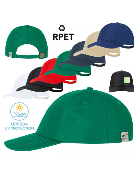 Gorra deportiva de 5 paneles en poliéster RPET con protección UV50. Ajustable cierre de hebilla metálica y orificios de ventilación bordados. Con logotipo de RPET y UV en etiqueta.El material RPET se elabora a partir de plástico reciclado, para así fomentar la reutilización de residuos plásticos y ayudar a la sostenibilidad del planeta. 6 Paneles. Cierre Hebilla. Protección UPF50