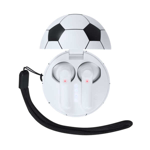 Headphones with football design case. With Bluetooth® 5.3 connection and 3W power, and 200 mAh battery through included USB-Type C cable. Includes handle for easy transport. Bluetooth Connection. Battery 25 mAh/ Charging Station 200 mAh