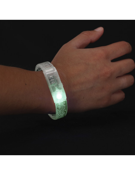 Original bracelet with multicolor LED lights ideal for parties, evening events or themed celebrations. Its strap generates a striking and original lighting effect powered by button batteries -included-. With discreet on/off switch on the side. Multicolour Led Lights. Button Batteries Included