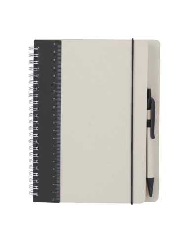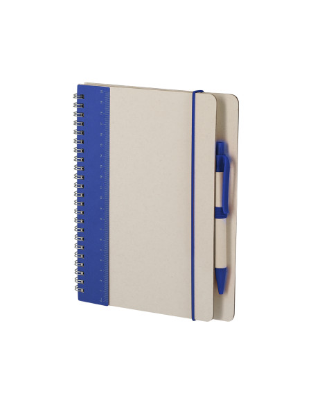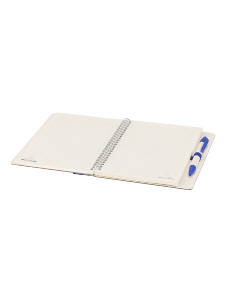 Notebook with hard covers made from recycled milk cartons. With a dual-color design. Includes 70 sheets of natural color striped, with elastic band and color pen holder. Includes Recycled Milk Carton badge on back cover and inner sheets. Includes pen with body in recycled milk carton, with heat clip in blue ink. Includes distinctive logo from Recycled Milk Cartons. Hard Cover. 70 Sheets. Recycled Milk Cartons Pen Included
