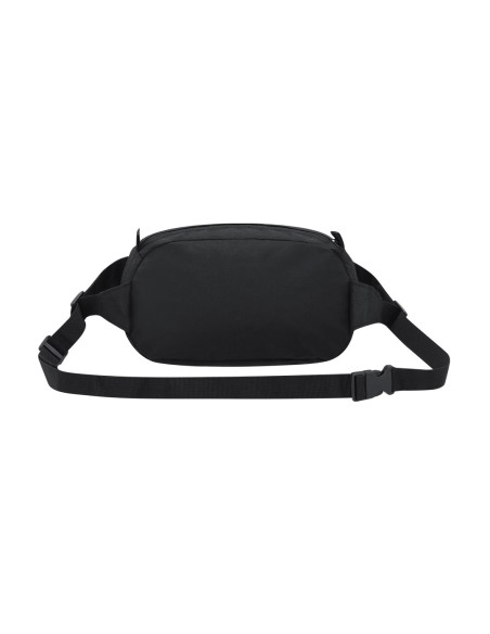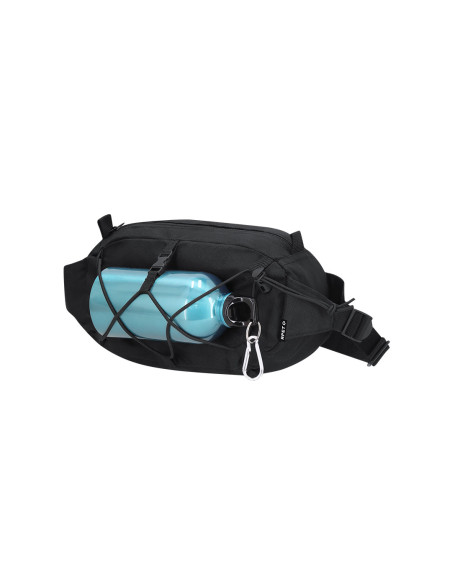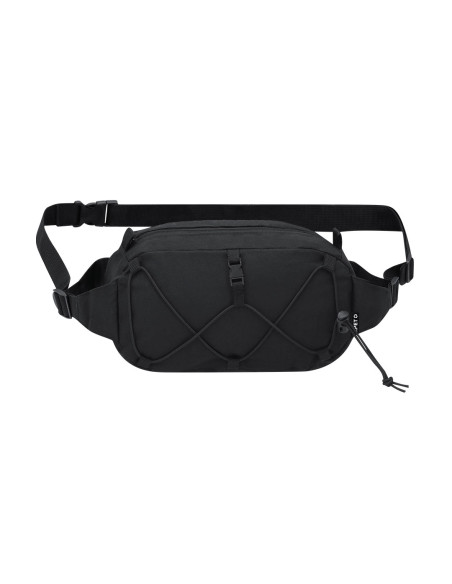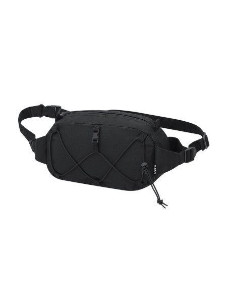 Fanny pack made of 600D RPET polyester. It has a main pocket with invisible zipper closure in black, with black metal puller, and adjustable strap with buckle closure on the strap. On the front it includes an adjustable elastic cord. Includes distinctive RPET label.