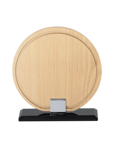 Trophy plaque with round design made of wood with a glass base. Joined by a silver metal piece. Ideal for personalized gifts, recognitions, awards and decoration.