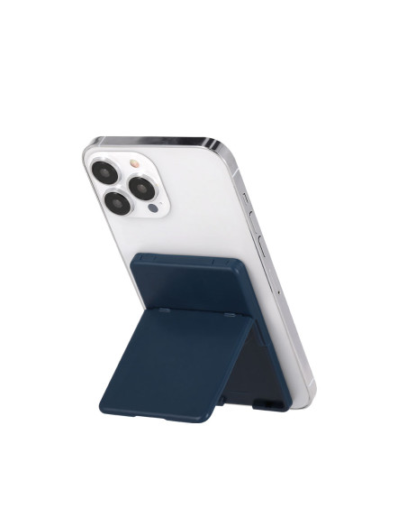 Card holder with multifunctional stand that allows various positions, and capacity for two cards. Magnetic attachment to the smartphone, body with matte finish. Magnetic. 1 Compartment