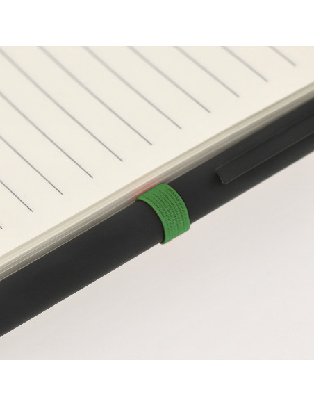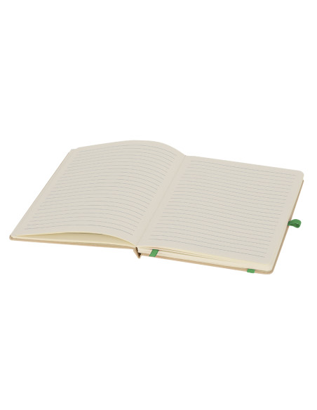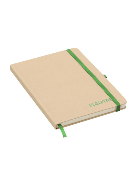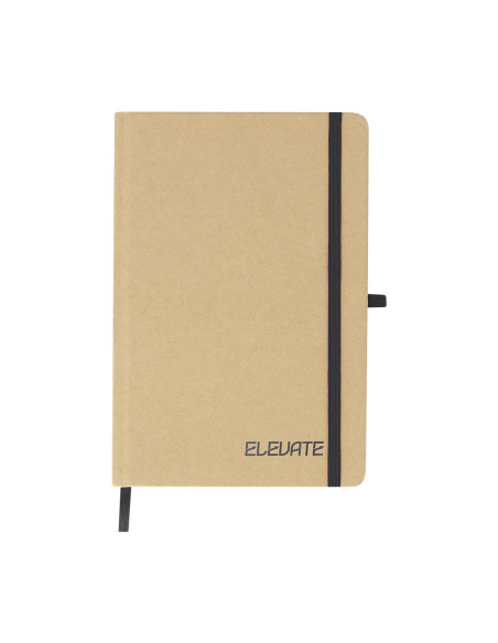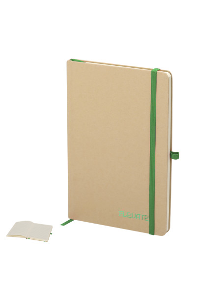 Notepad with rigid covers made from recycled cardboard. Includes 80 sheets of natural color striped, with elastic band, pen holder and color bookmark. Special laser engraving printing. Hard Cover. 80 Sheets