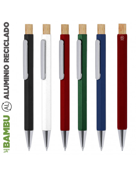 Elegant pen made from recycled aluminum. Body in distinguished hexagonal shape, with chrome clip and tip. Push mechanism made from bamboo and blue ink. With distinguished logo of recycled aluminum embossed on the body.Recycled aluminum is a material with almost infinite recycling possibilities, without losing its original properties and consuming less energy in this process.GRS certification (Global Recycled Standard), which guarantees the recycled origin of the material used to manufacture the product.Materials like bamboo promote the use of natural raw materials, reducing contaminating emissions. It comes from a highly resistant and versatile plant, with rapid growth and regeneration, making it an excellent alternative to traditional wood. Jumbo Refill
