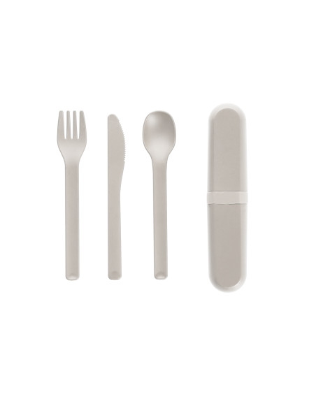 Set of cutlery made of PLA, in matching presentation case. The case has a push closure system for added security. This complete set includes a spoon, fork and knife. 3 Pieces