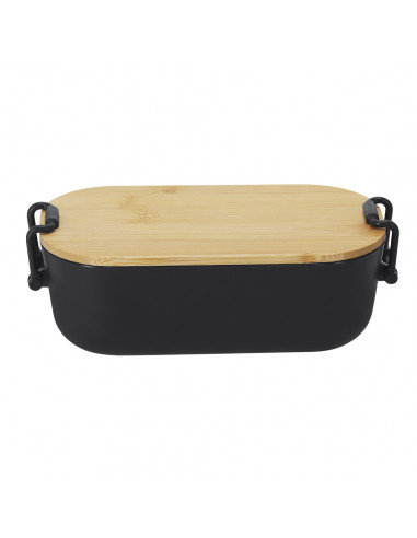 Lunch box with 850 ml capacity. Made of durable recycled PP with airtight bamboo lid. Features side safety locks. Includes Recycled PP emblem. Recycled PP is a recycled and highly recyclable plastic, strong and suitable for multiple applications. With Food Grade certification, guaranteeing safety when food comes into contact with the material used to manufacture the product. 850 ml