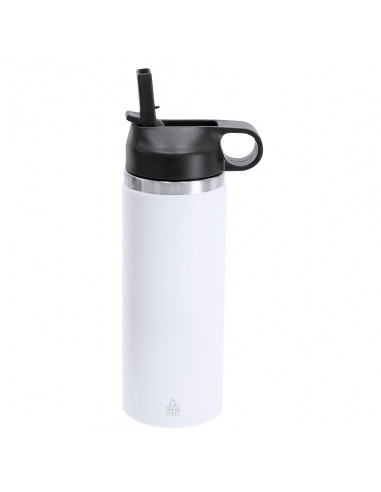 500 ml bottle made of recycled stainless steel with double wall, ensuring better and longer-lasting temperature preservation. Easy-open system with BPA-free straw dispenser and matching carrying handle. Includes recycled stainless steel emblem. Steel is one of the most in-demand materials and can be found almost everywhere, from everyday products to large constructions. With countless properties, notably its durability and high level of reusability, it has become a highly valued alternative in sustainable solutions. When properly treated, it provides new resources for infinite use. 500 ml