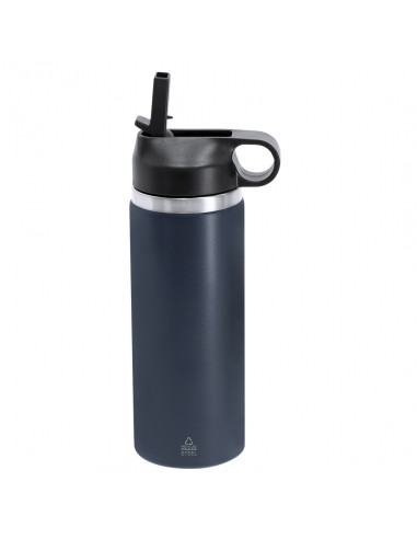500 ml bottle made of recycled stainless steel with double wall, ensuring better and longer-lasting temperature preservation. Easy-open system with BPA-free straw dispenser and matching carrying handle. Includes recycled stainless steel emblem. Steel is one of the most in-demand materials and can be found almost everywhere, from everyday products to large constructions. With countless properties, notably its durability and high level of reusability, it has become a highly valued alternative in sustainable solutions. When properly treated, it provides new resources for infinite use. 500 ml