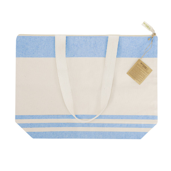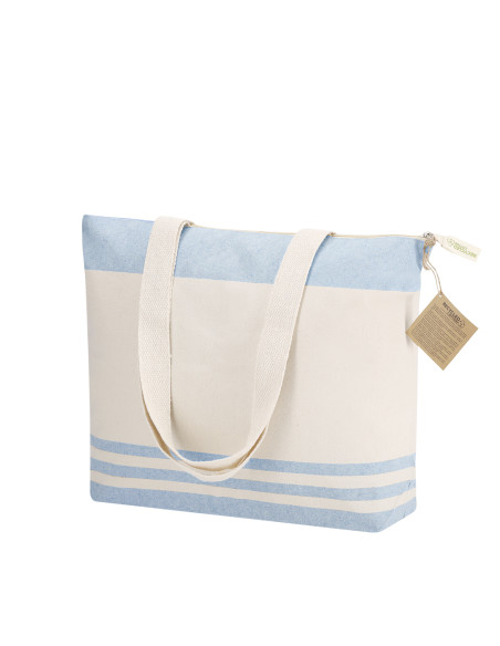 Bag made mainly of 300 g/m2 recycled cotton in an elegant natural tone with horizontal striped design in color. With gusset at base and sides. Long handles of 70cm with reinforcement, sewn finish. Logo on zipper label.