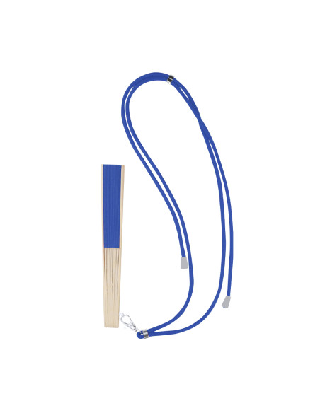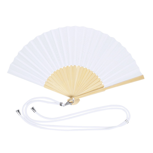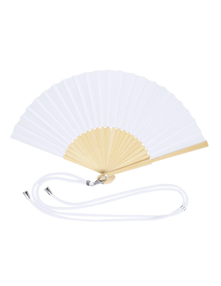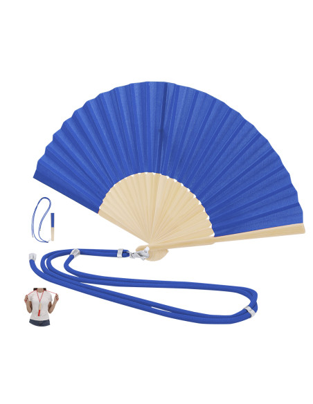 Fan made with resistant polyester fabric and flexible bamboo rods. It includes an adjustable cord to match the fabric and a practical metal carabiner for easy transport.