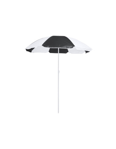 Beach umbrella of 8 panels in resistant nylon and in 2 color combination. 150cm in diameter, with side skirts with piping and metal coated tubes in white color. Adjustable in height and presented in a PVC sleeve with shoulder strap. Available in a wide range of combined colors. PVC Pouch