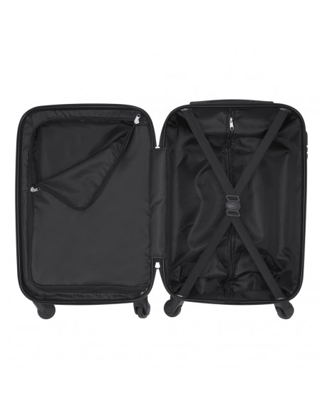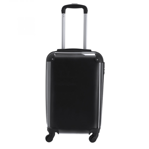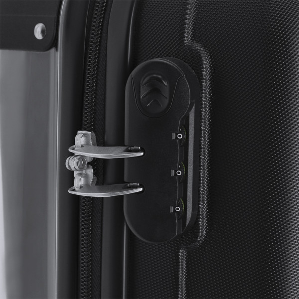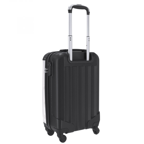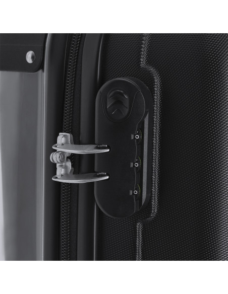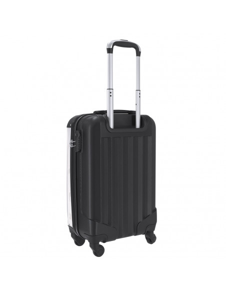 Trolley ideal for customisation with your own design. Features a transparent PC front cover that allows easy insertion of the desired design, providing maximum visibility. The back is made of durable black ABS, offering strength and resistance. Equipped with side security lock with combination and double pullers on zippers. Inside includes a zipped compartment and adjustable straps. With telescopic handle and 4 swivel wheels. Rigid. 4 Rotating Wheels. Combination Lock