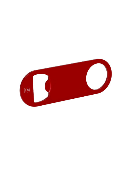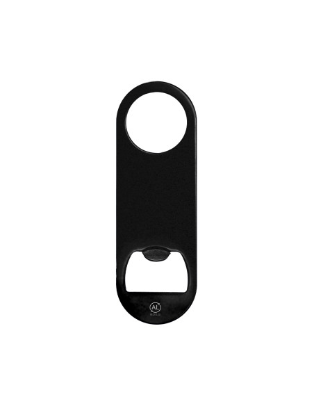 Recycled Aluminum Opener with shiny metallic finish. One end with bottle opener and at the opposite end with a circular hole of 3 cm in diameter. Includes Recycled Aluminum logo.