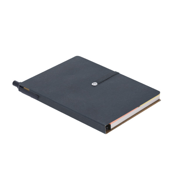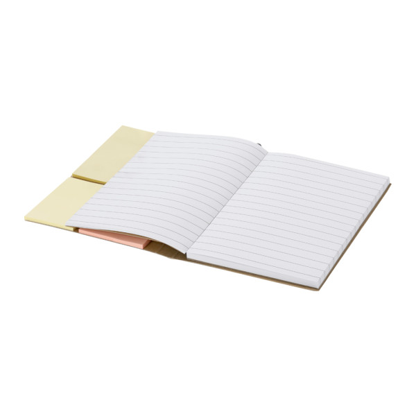 Bloc con notas adhesivas en cartón reciclado. Con tapas rígidas, incluye bloc de 70 hojas blancas de disposición a una raya. En la cubierta interior de la portada incluye: 25 hojas adhesivas amarillas 6x3,8 cm, 25 hojas adhesivas amarillas 7,5 x 9 cm y 100 mininotas adhesivas de varios colores y práctico bolígrafo en cartón reciclado de tinta azul con sistema pulsador. Incluye cinta elástica a juego para asegurar cierre. 25 Notas Adhesivas 7,5 x 9 cm. 25 Mininotas Adhesivas 3,8 x 6 cm. 100 Mininotas Adhesivas 1,2 x 4,5 cm. Bolígrafo Cartón Reciclado Incluido