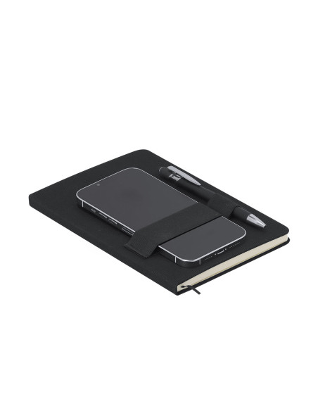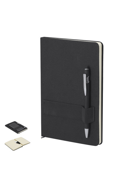 Bloc de notas en tamaño A5 fabricado en elegante RPET. Portadas rígidas en acabado tela. Incluye banda elástica en la tapa, ideal para sujetar móvil y portabolígrafos elástico. Interior con 80 páginas a disposición de una raya, marcapáginas de cinta en combinación y sobre en las contraportadas. Incluye bolígrafo con tinta azul, cuerpo de aluminio acabado goma, clip metálico y tiene acción por pulsador en combinación. Presenta distintivo logotipo RPET. Portada Rígida. 80 Hojas. Bolígrafo Aluminio Incluido. Acabado Caucho. Carga Jumbo