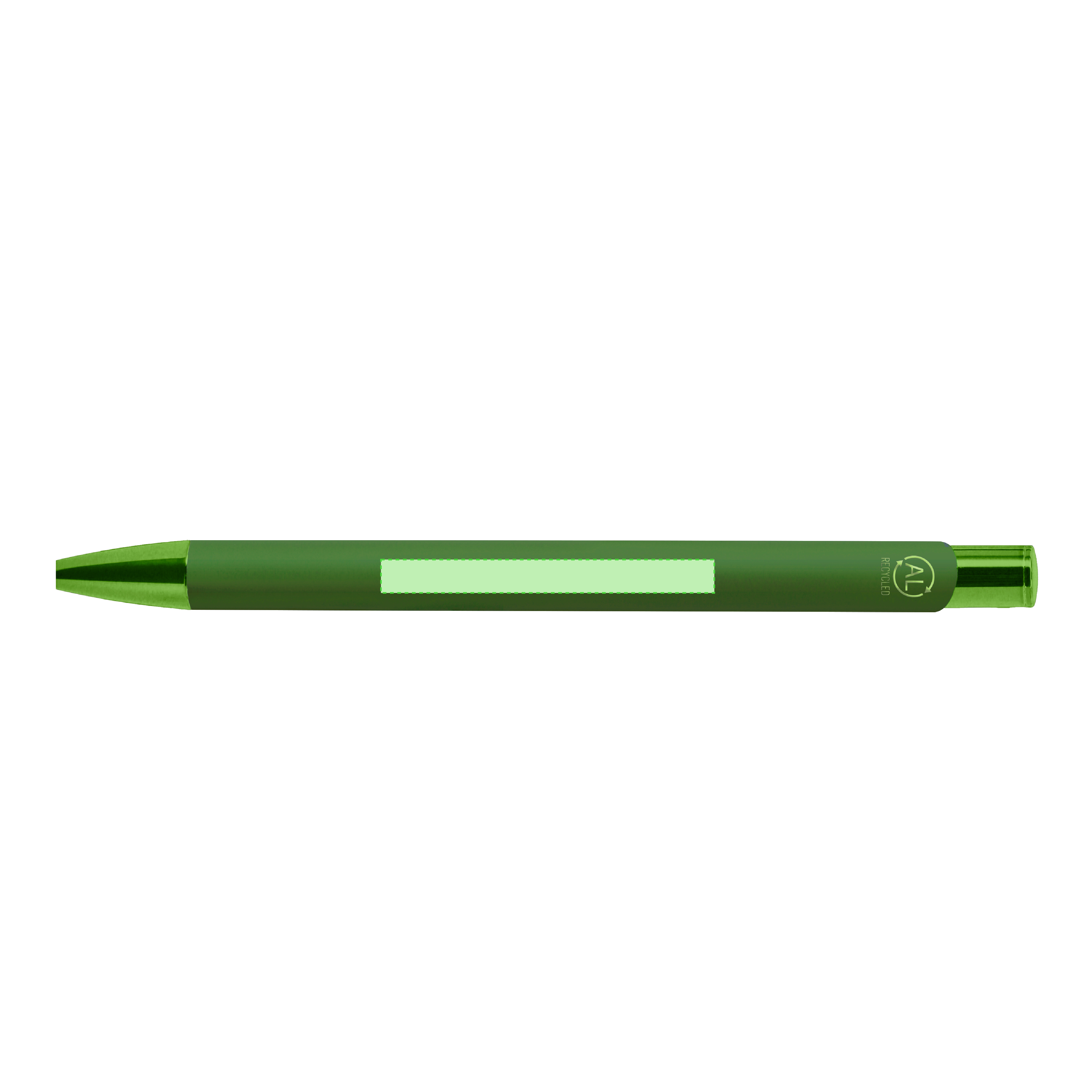 Bolígrafo de mecanismo pulsador. Acabado en aluminio reciclado gomoso, de cartucho jumbo y tinta azul. Diseño especial para grabado láser con resultado en efecto espejo.Con distintivo logo de Aluminio Reciclado. Carga Jumbo