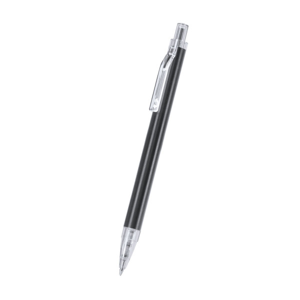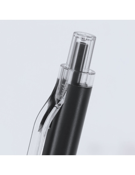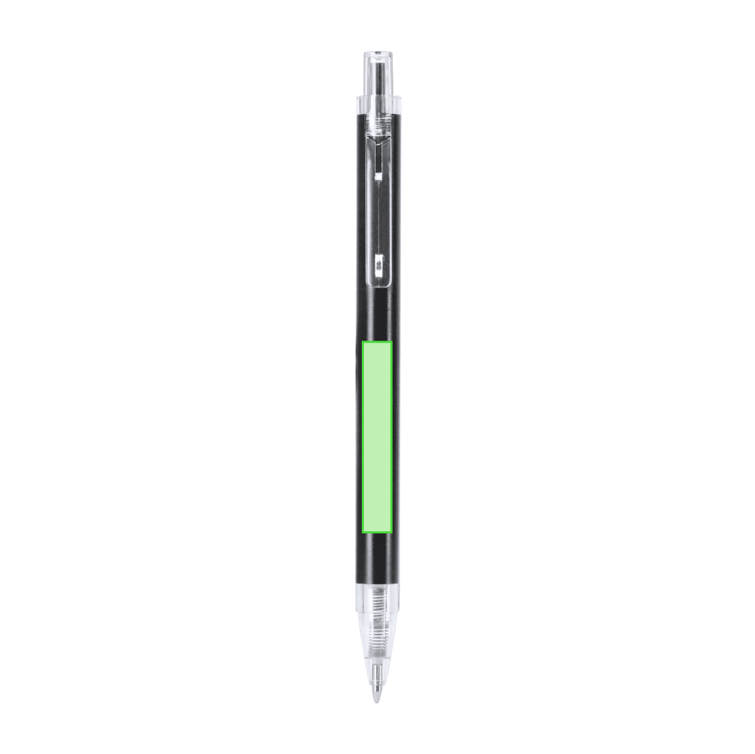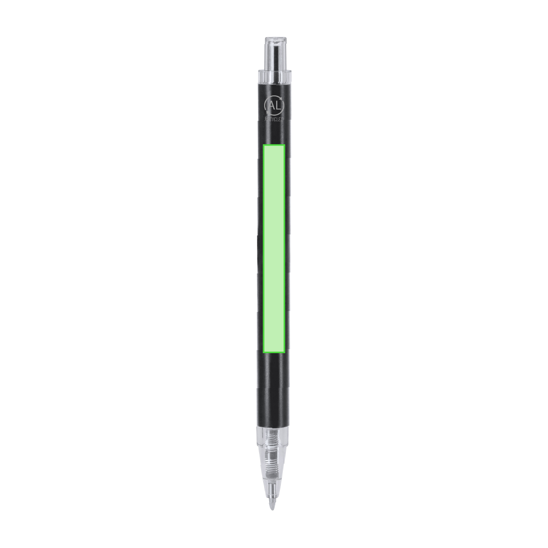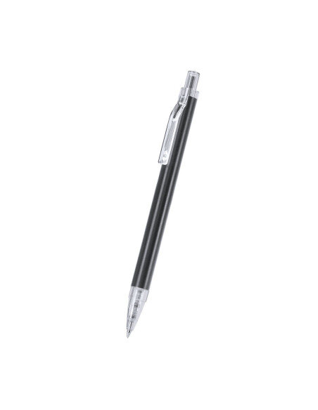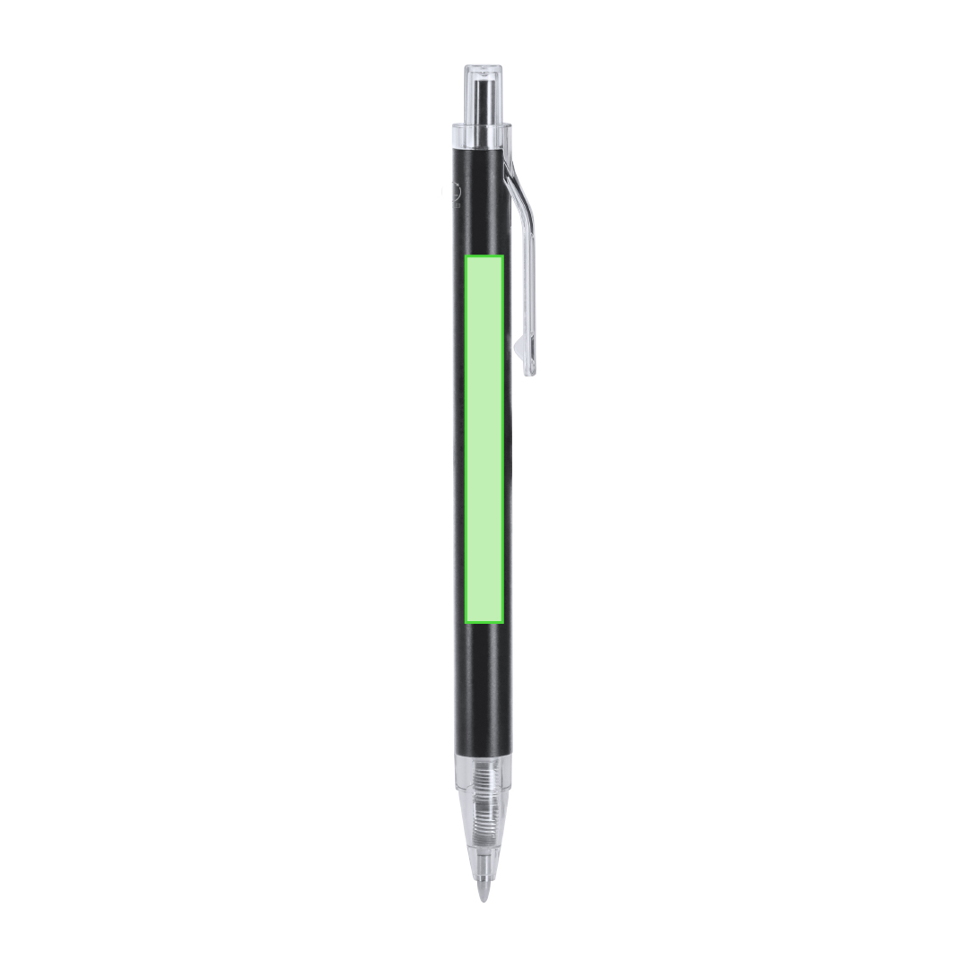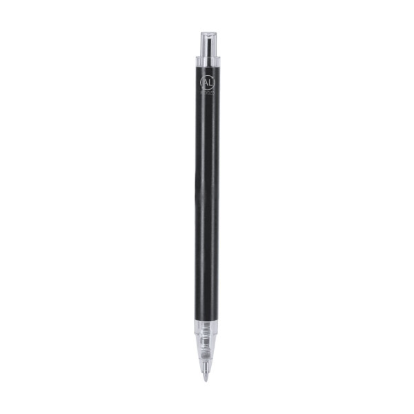 Bolígrafo con cuerpo en Aluminio reciclado. Clip, pulsador, punta en acabado transparente. Carga jumbo y en tinta azul. Incluye distintivo Aluminio reciclado. Carga Jumbo