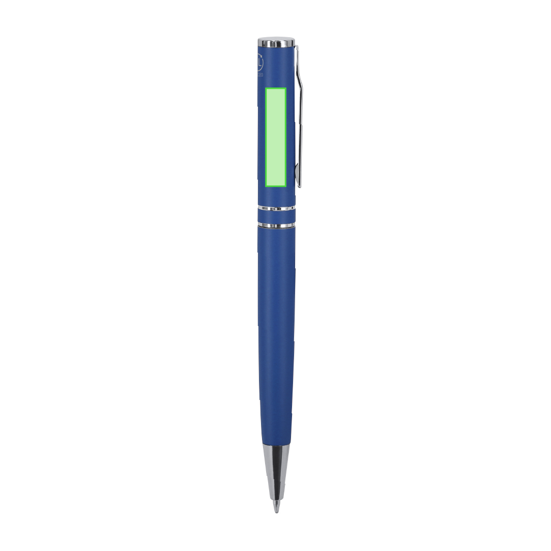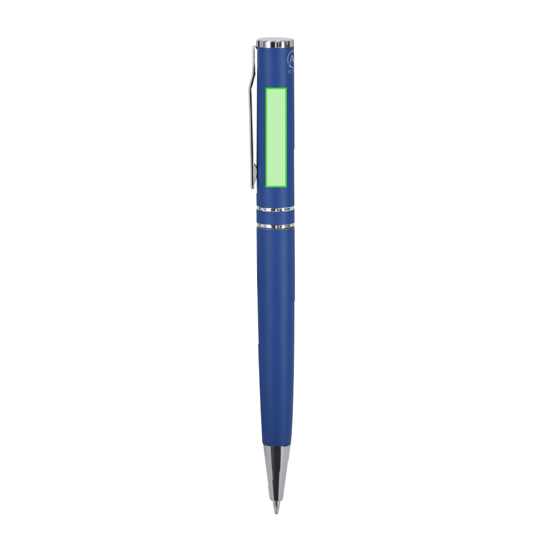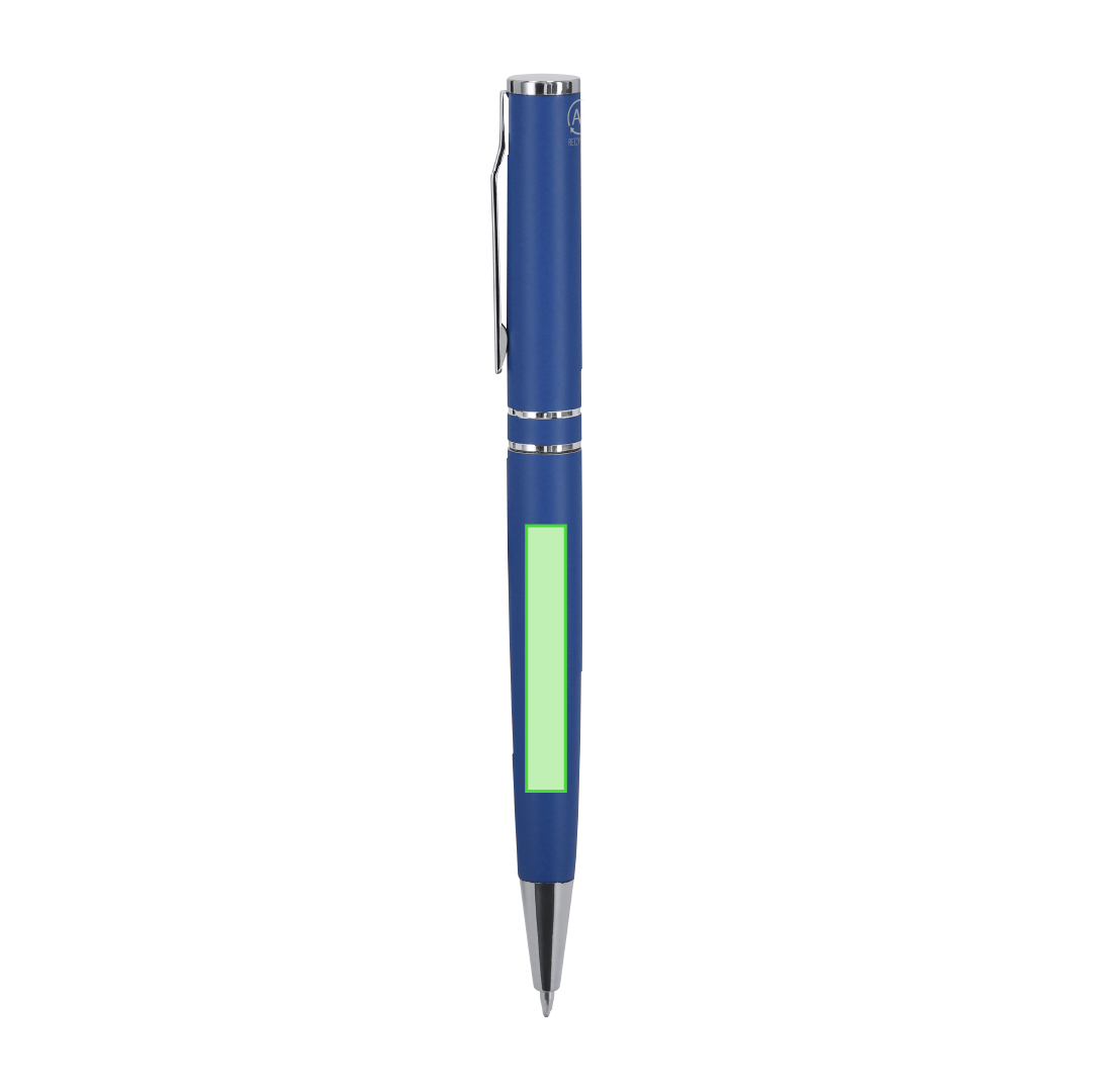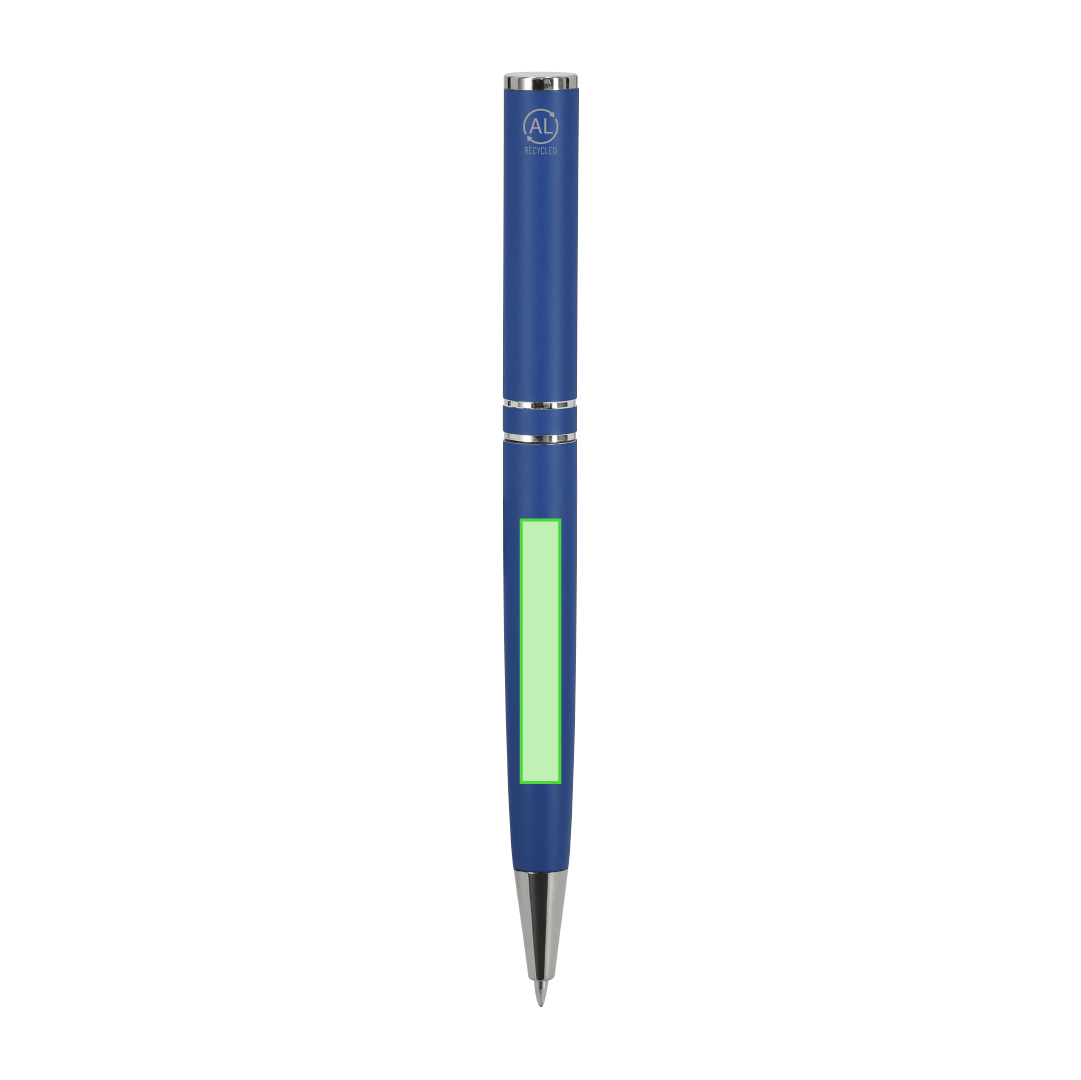 Bolígrafo con mecanismo de giro, fabricado en Aluminio Reciclado. Cuerpo con acabado mate. Incluye accesorios cromados y clip a juego. Carga jumbo y tinta azul. . Incluye distintivo Aluminio reciclado. Carga Jumbo