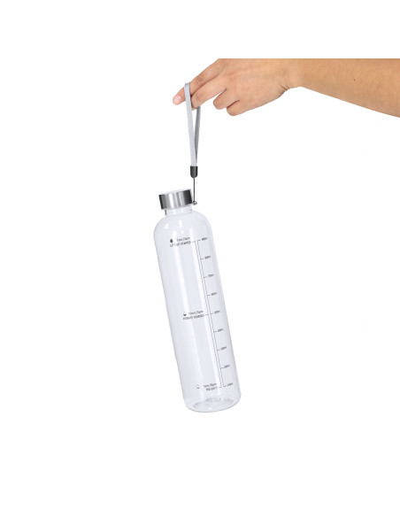 Bidón fabricado en RPET de 1L de capacidad, diseñado para fomentar una hidratación adecuada. Con cuerpo transparente. Incluye indicador de capacidad en litros y onzas, acompañado de frases motivadoras que inspiran a mantener una correcta hidratación diaria. Tapón, elaborado en Acero Inox, incluye práctico cordón para facilitar su transporte. Libre de BPA. 1 L