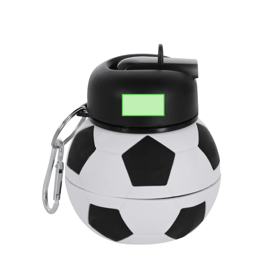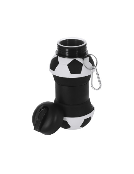Bidón plegable con diseño de balón de futbol con capacidad de 550 ml. Incluye anilla metálica con mosquetón para práctico transporte. Tapa de rosca con boquilla. Libre de BPA. 550 ml