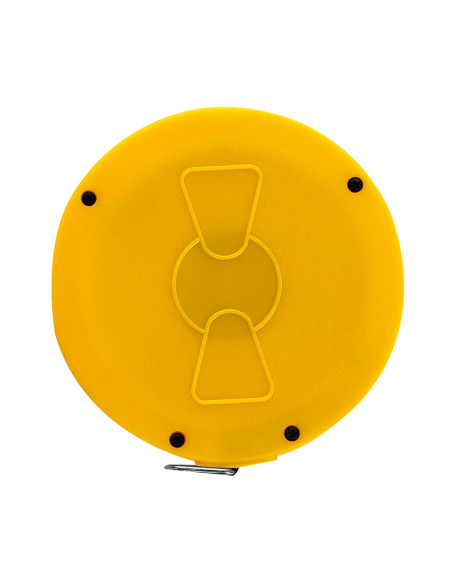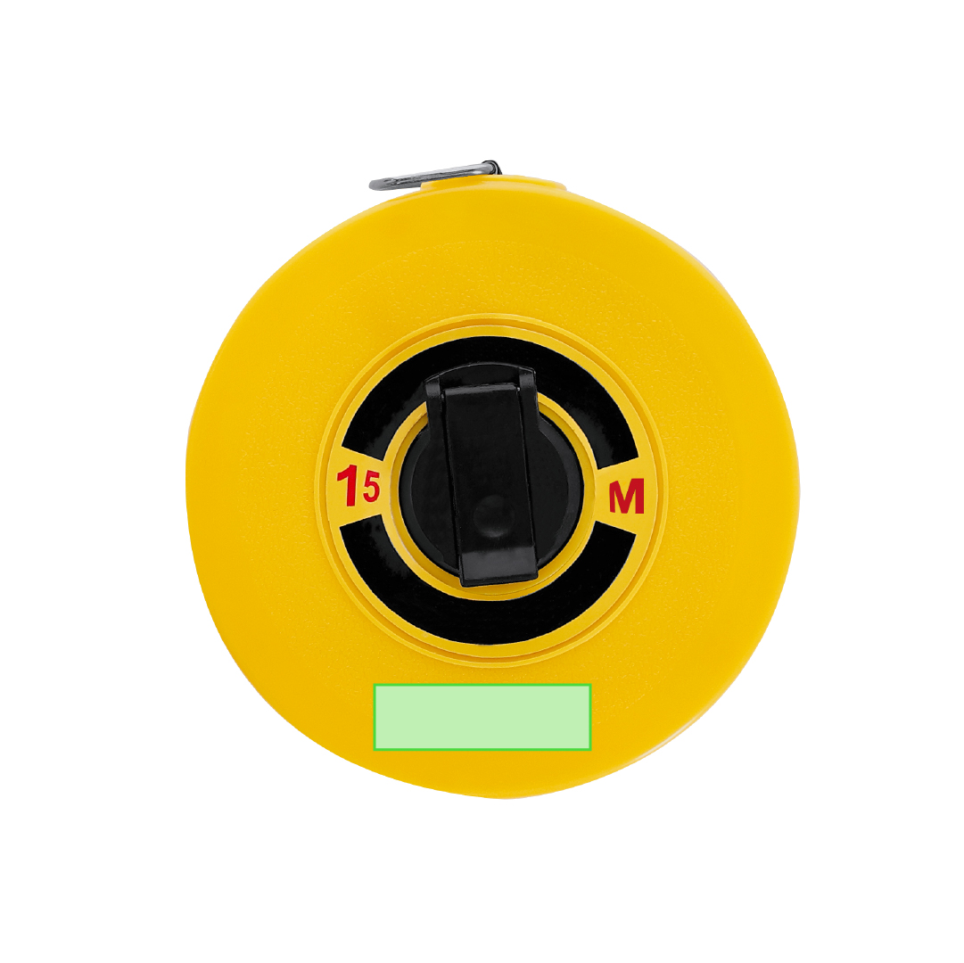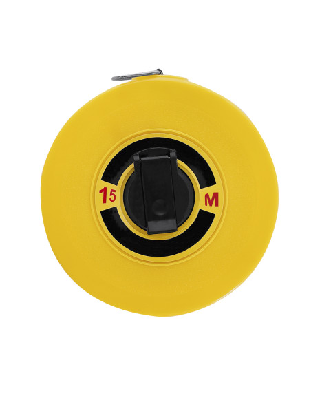 Cinta métrica 15 metros de largo en estuche PP y mecanismo en manivela. Escala impresa en cinta de PVC en negro para cm, y rojo para las pulgadas.