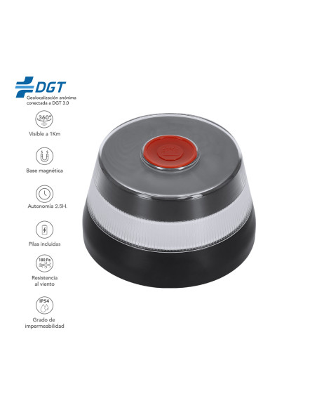 Luz de emergencia V16 Geolocalizada para vehículos. Fabricada conforme a la normativa de seguridad vigente y homologada por laboratorio acreditado IDIADA, según requisitos de la DGT , con número de homologación marcado en la parte inferior del artículo. Incluye una tarjeta SIM conectada con Telefónica Tech, con servicio de comunicación de datos hasta 12/2038, sin gastos ni cuotas adicionales. De activación manual y con base de fijación magnética. Resistencia al viento de hasta 180Pa, visibilidad 360° -hasta 1 km de distancia- y resistencia al agua conforme a estándares IP54. De tamaño compacto para guardar en cualquier compartimento del vehículo y tenerla a mano en caso de emergencia. Presentada en caja individual de diseño. Manual incluido (español e inglés). Alimentación a pilas (3xAA pilas alcalinas incluidas), con una autonomía de 2.5 horas. 12 Ledes Intermitentes. Magnética. 3 Pilas AA Incluidas