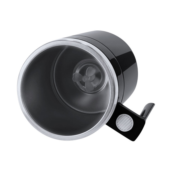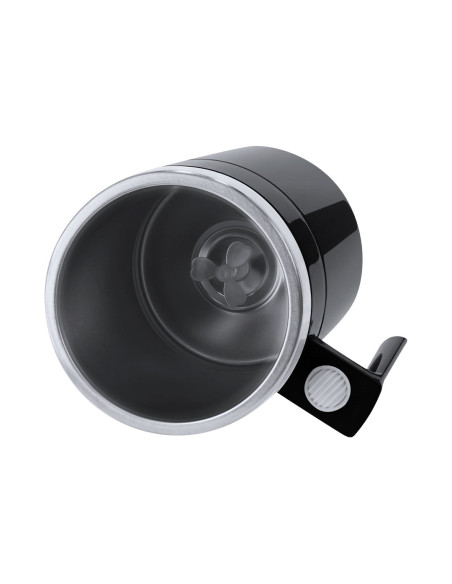 Taza mezcladora fabricada en resistente Acero Inox de 400ml de capacidad. Incluye tapadera con boquilla deslizante. En la base del interior incluye agitador eléctrico alimentado por 2 pilas AAA (no incluidas). Con botón de on/off en mango. 400 ml. 2 Pilas AAA No Incluidas