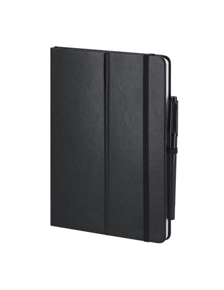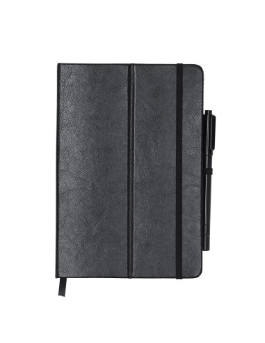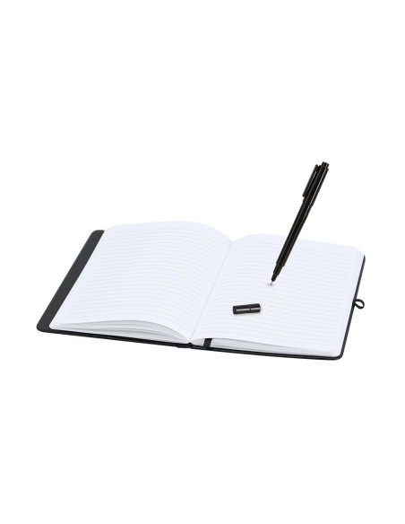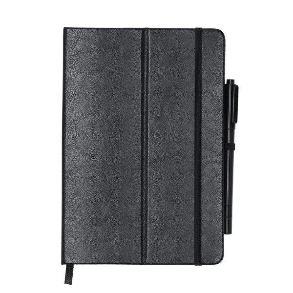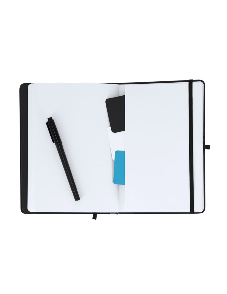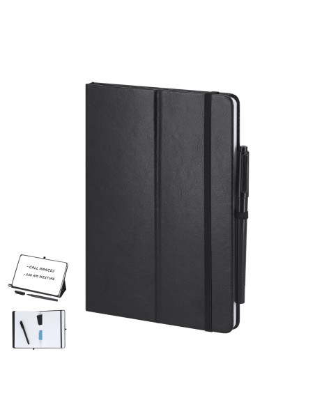Bloc de notas pizarra en PU reciclado. Con pizarra en primera página, incluye bolígrafo rotulador y borrador en tinta negra. Con 80 hojas a disposición de una raya. Portada plegable con función soporte, y cinta elástica para cierre seguro.Ideal para tomar notas rápidas, apuntes, crear diseños en tu jornada laboral o en casa.Incluye distintitov logo PU Reciclado. 80 Hojas. Bolígrafo Rotulador Tinta Negra y Paño Limpiador Incluido
