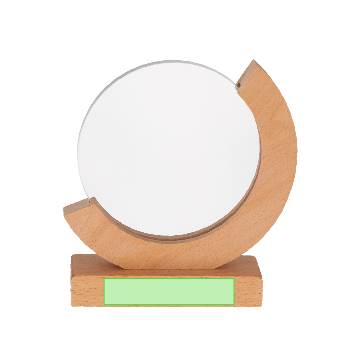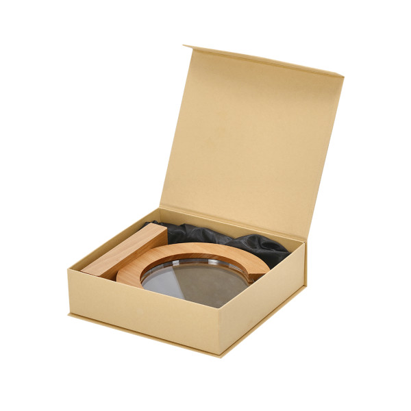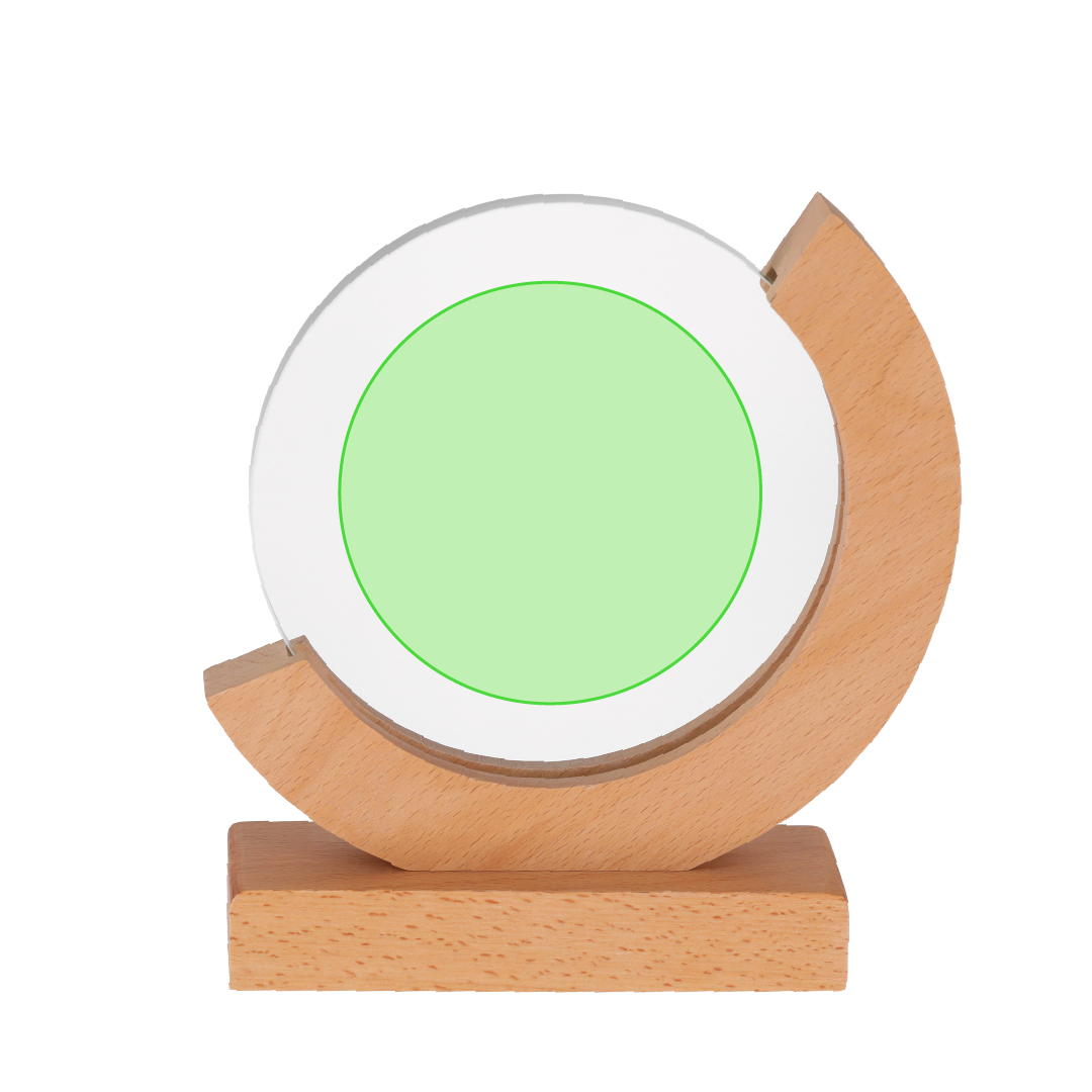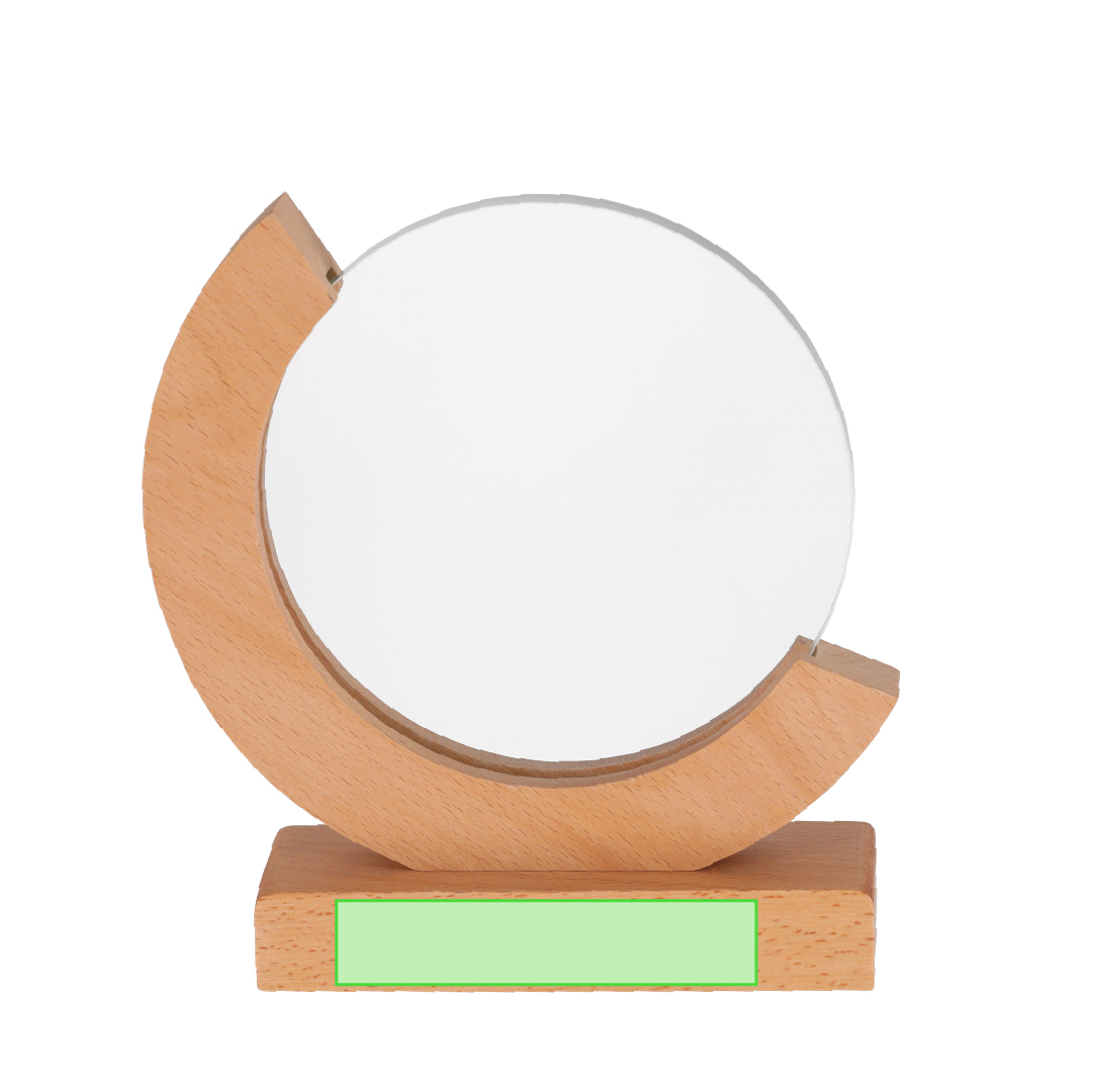 Placa trofeo de grueso cristal con elegante diseño circular con base en madera. Ideal para regalos personalizados, reconocimientos, premios y decoración. Presentada en estuche de protección individual en acabado Kraft.