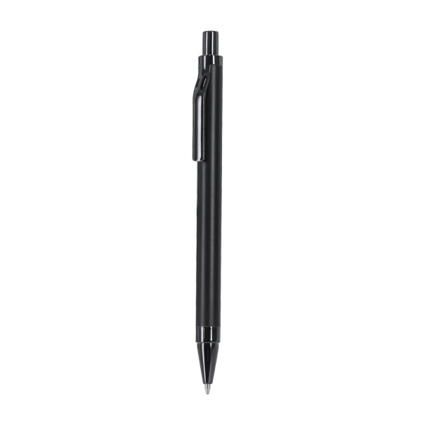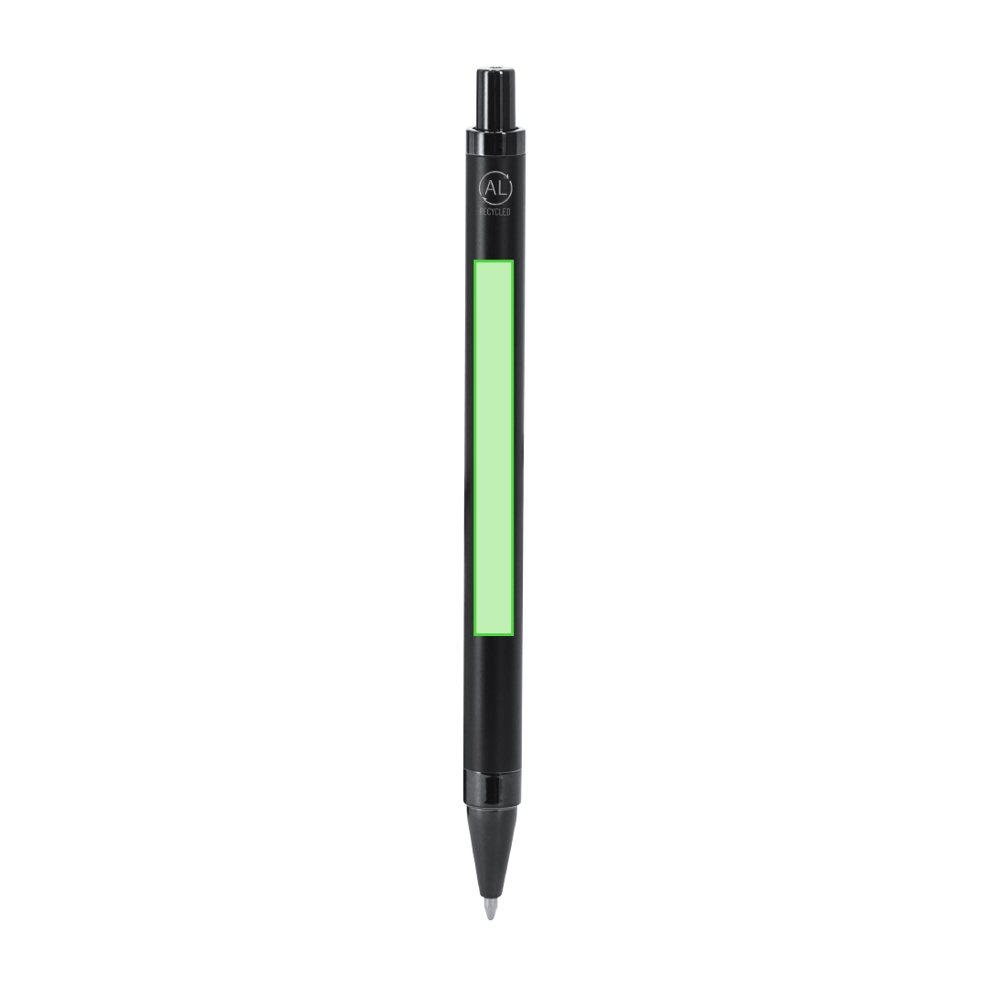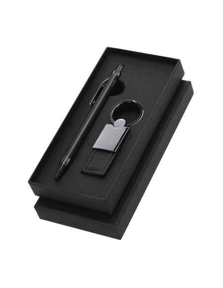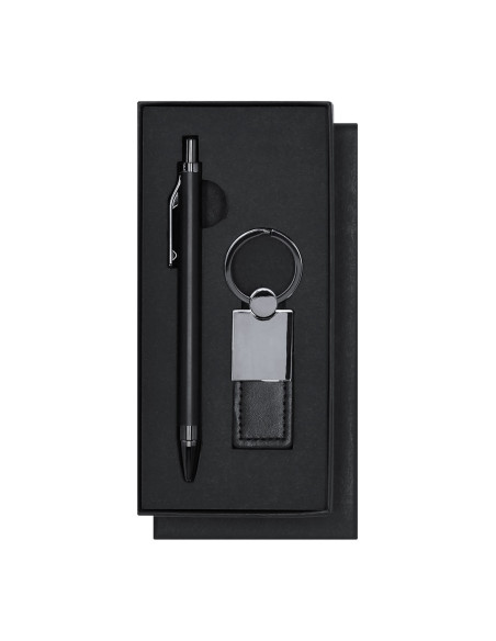 Elegante set premium que incluye:Bolígrafo en Aluminio Reciclado de acabado negro mate, de mecanismo pulsador y tinta azul. Con clip y puntera en pulido ABS. Incluye distintivo Aluminio reciclado.Elegante llavero con cinta fabricada en poliéster PU y accesorios cromados. Bolígrafo Aluminio Reciclado. Llavero Metal/ PU