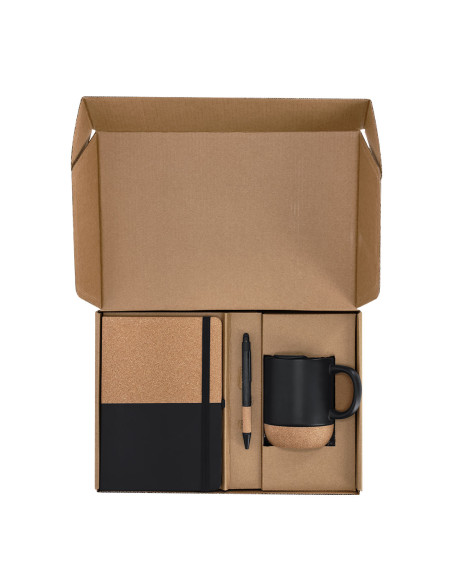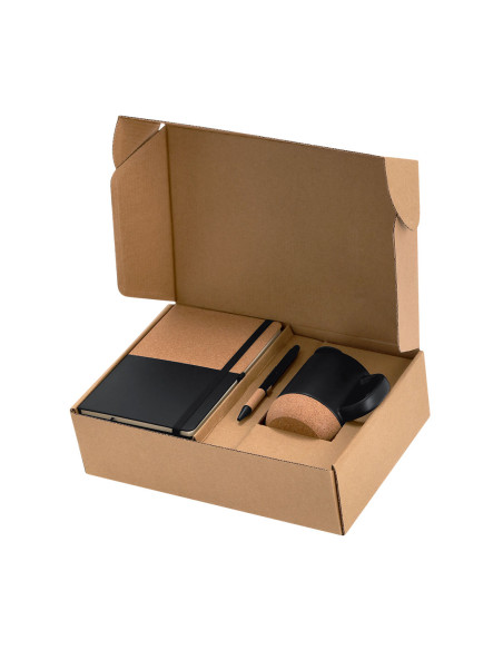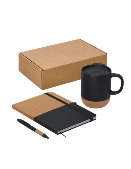 Set de bloc de notas, bolígrafo y taza . Incluye:- Bloc de notas de tapas rígidas, de corche y PU, marcapáginas de tela y elástico de sujeción a juego. 80 hojas interiores con disposición a una raya.- Bolígrafo con cuerpo recubierto en corcho y aluminio. Elegante clip y accesorios a juego, de mecanismo pulsador y en tinta azul.- Taza de cerámica con capacidad de 330ml, con diseño de base en corcho. Incluye tapa con boquilla deslizante. Taza Cerámica/ Corcho, 330 ml. Bloc PU/ Corcho, Portada Rígida, 80 Hojas. Bolígrafo Aluminio/ Corcho