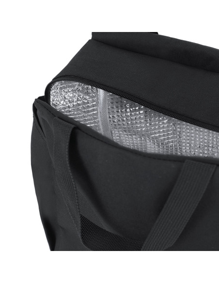 Bolsa nevera isotérmica confeccionada en poliéster RPET 600D. Compartimento principal acolchado con cierre de cremallera con tirador metálico. En los laterales cuenta con bolsillos abiertos, y asar para fácil transporte en la parte superior.
