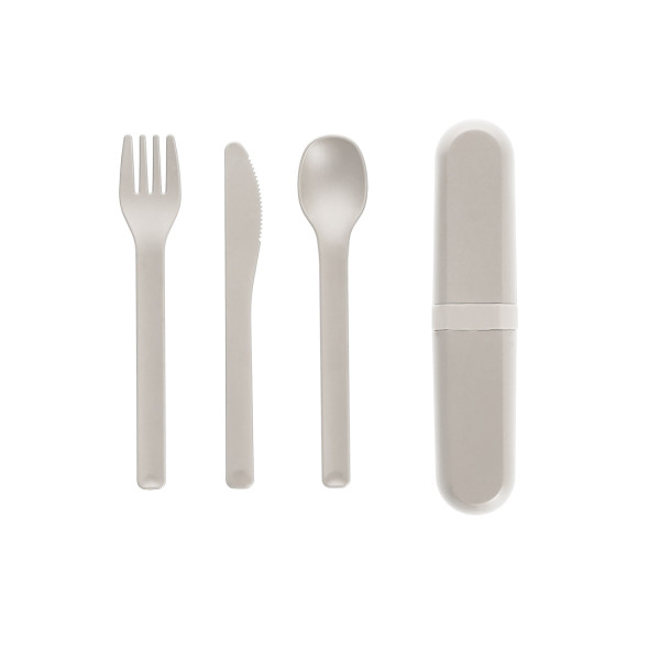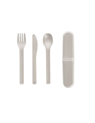 Set de cubiertos elaborados en PLA, en estuche de presentación a juego. El estuche cuenta con sistema de cierre push para mayor seguridad. Este completo set incluye cuchara, tenedor y cuchillo. 3 Piezas