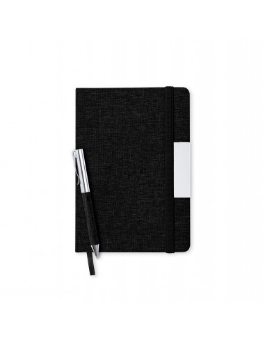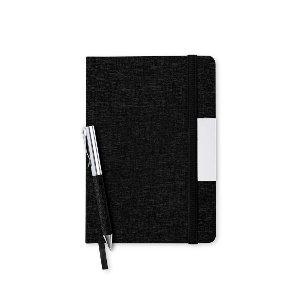 Set de bloc de notas y bolígrafo en RPET, elaborado a partir de plástico reciclado para así fomentar la reutilización de residuos plásticos y ayudar a la sostenibilidad del planeta. Incluye: Bloc de notas de tapas rígidas, con detalle metálico en la portada, marcapáginas de tela y elástico de sujeción a juego. 100 hojas interiores con disposición a una raya y distintivo RPET.Bolígrafo fabricado en metal cromado y con cuerpo recubierto en poliéster RPET. Elegante clip metálico y accesorios a juego, de mecanismo giratorio y en tinta azul. Con distintivo RPET en cuerpo.Set presentado en elegante estuche de diseño en color negro, con compartimento independiente para bloc de notas y bolígrafo. Bloc Portada Rígida. 100 Hojas. Bolígrafo Incluido