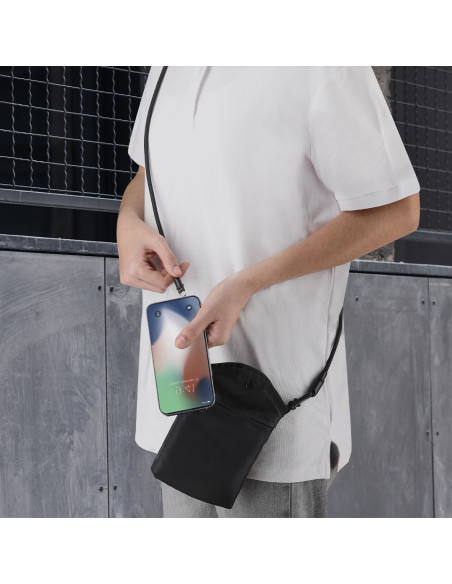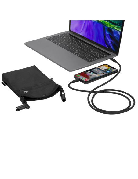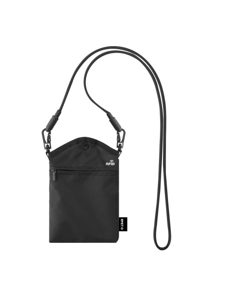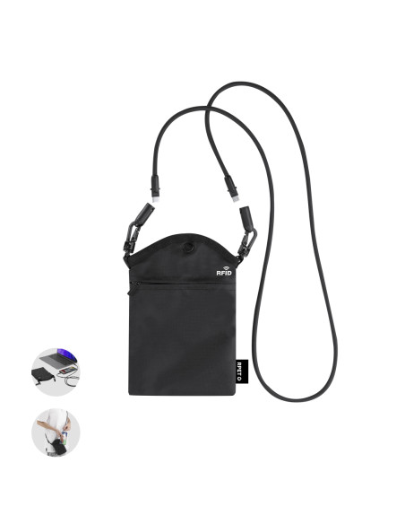 Portatodo fabricado en RPET. Compartimento principal con cierre de botón y bolsillo en la parte frontal con sistema de cierre en cremallera. Incluye sistema de protección RFID, diseñado para bloquear accesos no autorizados a tarjetas contactless.Cinta de transporte 2 en 1 unida mediante mosquetones con función de cable apto para transferir datos, con conexión Tipo C de 60W. Incluye distintivo logotipo RFID y RPET. Protector RFID. Cable Cargador, Apto para transferir datos, Conexión Tipo C PD 60W