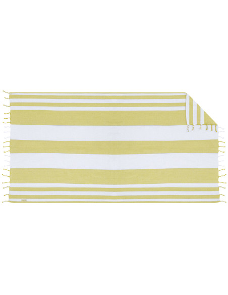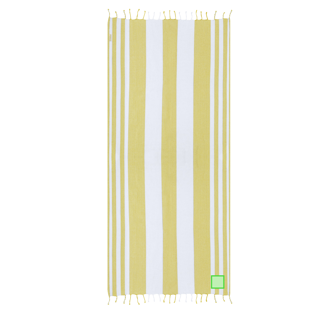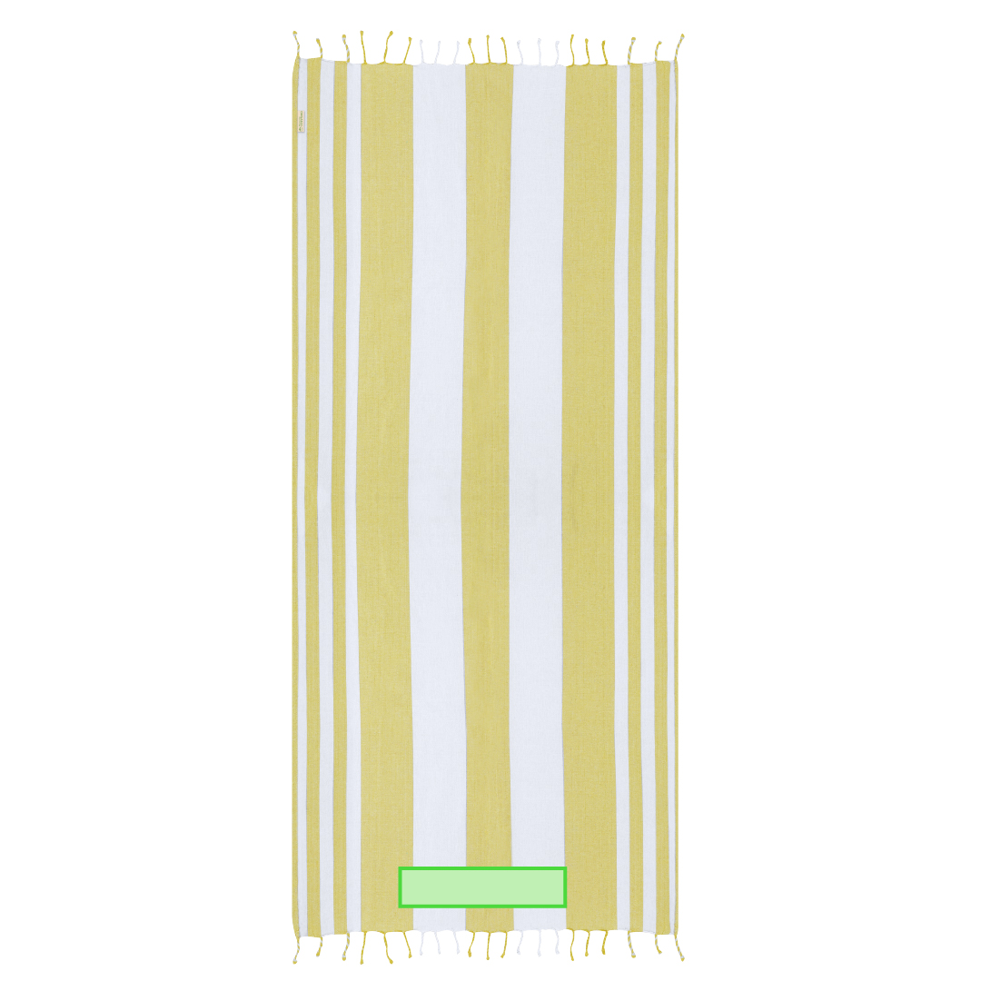 Suave pareo-toalla de 180g/m2 en combinación de Algodón Reciclado y Poliéster RPET. Su diseño cuenta con una base en color y rayas blancas. Incluye flecos en los extremos que añaden un detalle decorativo y que completan su acabado.