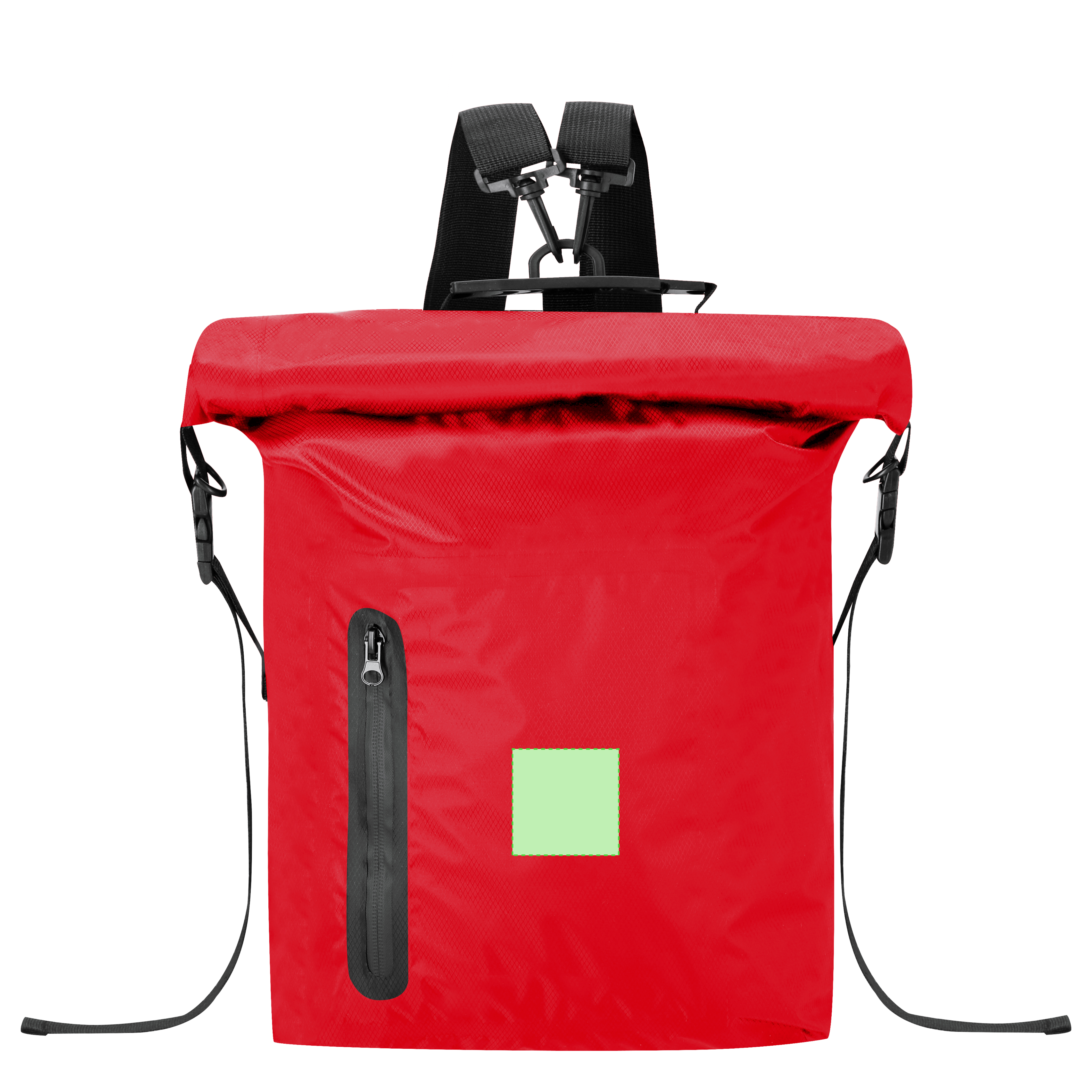 Mochila confeccionada en resistente Riptop impermeable. Con sistema de cierre enrollable y hebillas ajustables laterales. Dispone debolsillo frontal y con capacidad de 30L. Cintas de hombros y espalda ajustables. Con original enganche a través de mosquetones unidos al asa superior. 30 L. Impermeable
