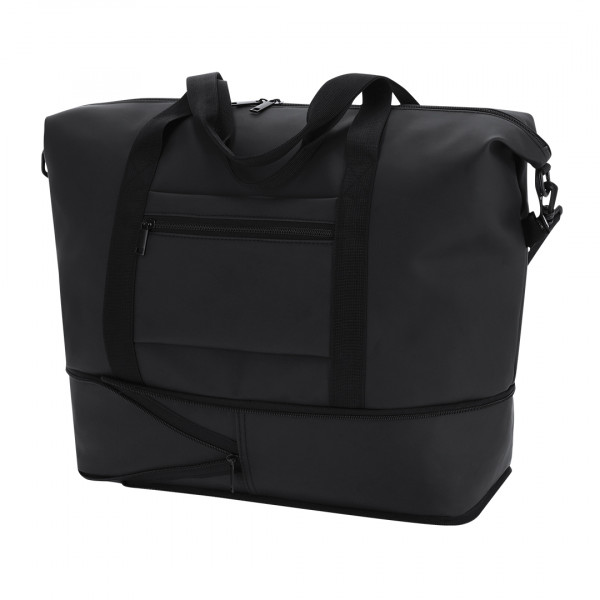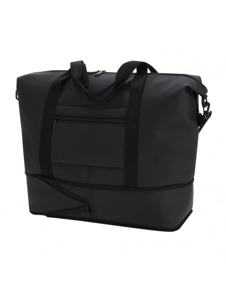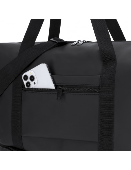 Bolso extensible confeccionado en suave PU, diseñado para ofrecer una solución práctica y versátil. Cuenta con bolsillo frontal para trolleys y maletas, aportando funcionalidad durante su transporte. Sistema de cierre mediante tiradores metálicos. Incluye asas de transporte y correa ajustable para el hombro.